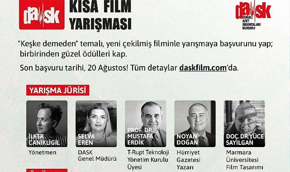 DASK Uluslararası Kısa Film Yarışması’nın kesinleşen jüri üyeleri arasında yönetmen İlker Canikligil, Türk Reasürans ve DASK Genel Müdürü Selva Eren, T-Rupt Teknoloji Yönetim Kurulu Üyesi Prof. Dr. Mustafa Erdik, Hürriyet Gazetesi Yazarı Noyan Doğan ve Marmara Üniversitesi Film Tasarımı ve Yönetimi’nden Doç. Dr. Yüce Sayılgan yer alıyor.