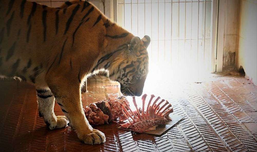 Antalya Büyükşehir Belediyesi Doğal Yaşam Parkı'nda bulunan Bengal kaplanlar için Dünya Kaplan Günü’ne özel olarak etten yapılmış pasta hazırlandı. Kaplanlar, karışık etlerden oluşan bu özel pastayı afiyetle yedi.