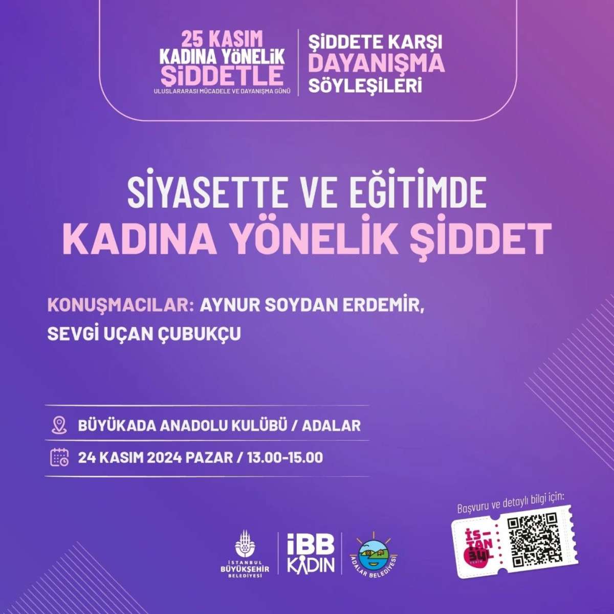 "25 Kasım Kadına Yönelik Şiddetle Uluslararası Mücadele ve Dayanışma Günü” kapsamında, Adalar Belediyesinin ev sahipliğini üstlendiği, İstanbul Büyükşehir Belediyesi Sosyal Hizmetler Daire Başkanlığı İBB Kadın iş birliği ile “Şiddete Karşı Dayanışma Söyleşileri" ana başlığı altında düzenlenen "Siyasette ve Eğitimde Kadına Yönelik Şiddet" semineri yapılacak.