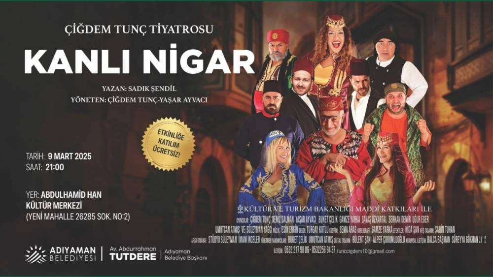 ADIYAMAN (PHA) - Murat KAYIŞ – Adıyaman Belediyesi, Çiğdem Tunç Tiyatrosu tarafından sahnelenen klasik eserlerden biri olan "Kanlı Nigar" tiyatro oyununu sanatseverlerle buluşturuyor. Sadık Şendil’in kaleme aldığı, Çiğdem Tunç ve Yaşar Ayvacı’nın yönetmenliğini üstlendiği oyun, 9 Mart 2025 Pazar günü saat 21.00’de Abdulhamid Han Kültür Merkezi'nde sahnelenecek.