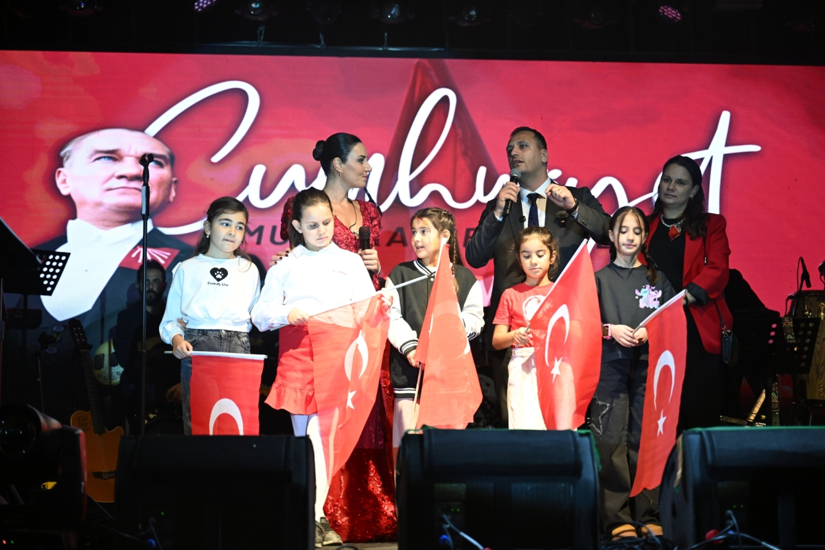 “Biraz önce sevgili Sevcan Orhan, bir kadın olarak türkü söyleyebilmenin özgürlüğünü verdiği için Mustafa Kemal’e teşekkür etti. Ben de bu nedenle beş güzel kız çocuğumuzla birlikte sahneye çıkmak istedim. Cumhuriyet her şeyden önce bir kadın devrimidir. Kadınların birey olarak kabul edilebilmesi, kız çocuklarının okuyabilmesi, öğretmen, doktor, mühendis olabilmesi için Mustafa Kemal Atatürk bu devrimi yaptı. Cumhuriyet, kadının ve erkeğin özgür ve eşit bireyler olarak kabul edildiği bir düzenin adıdır.”