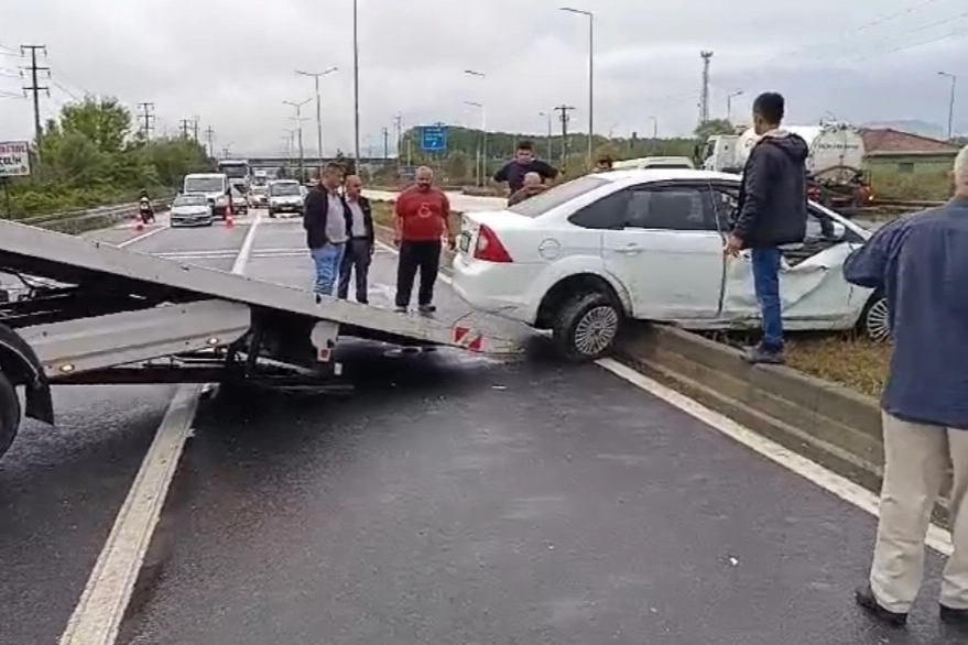 Düzce'de bir otomobil yağış nedeniyle kayganlaşan yolda orta refüje çıktı.