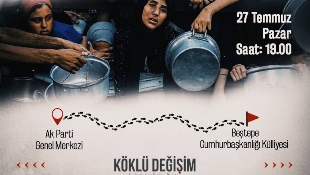 Köklü Değişim Dergisi tarafından organize edilen etkinliğin duyurusu, “Gazze ölüyor! Gazze için yürüyoruz” ifadeleriyle yapıldı. 27 Temmuz Pazar günü saat 19.00’da gerçekleştirileceği belirtilen yürüyüşün güzergâhı, AK Parti Genel Merkezi ile Beştepe’deki Cumhurbaşkanlığı Külliyesi arasında olacak. Etkinlik afişlerinde, katılımcılara “Sözü muhatabına söylemeye var mısın?” çağrısı yapılarak sessiz kalmama çağrısı öne çıkarılıyor.