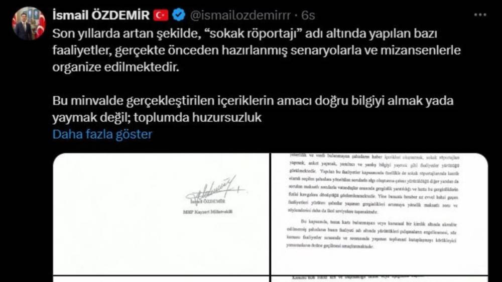ANKARA (PHA) - Gülbahar SÜNGÜ - Milliyetçi Hareket Partisi (MHP) Genel Başkan Yardımcısı ve Kayseri Milletvekili İsmail Özdemir, son yıllarda artış gösteren sokak röportajlarına ilişkin yeni bir düzenleme önerisiyle Türkiye Büyük Millet Meclisi’ne (TBMM) kanun teklifi sundu. Özdemir, sokak röportajlarının "dezenformasyon aracı" haline geldiğini savunarak, bu tür içeriklerin yalnızca yetkilendirilmiş kişiler tarafından yapılması gerektiğini belirtti.