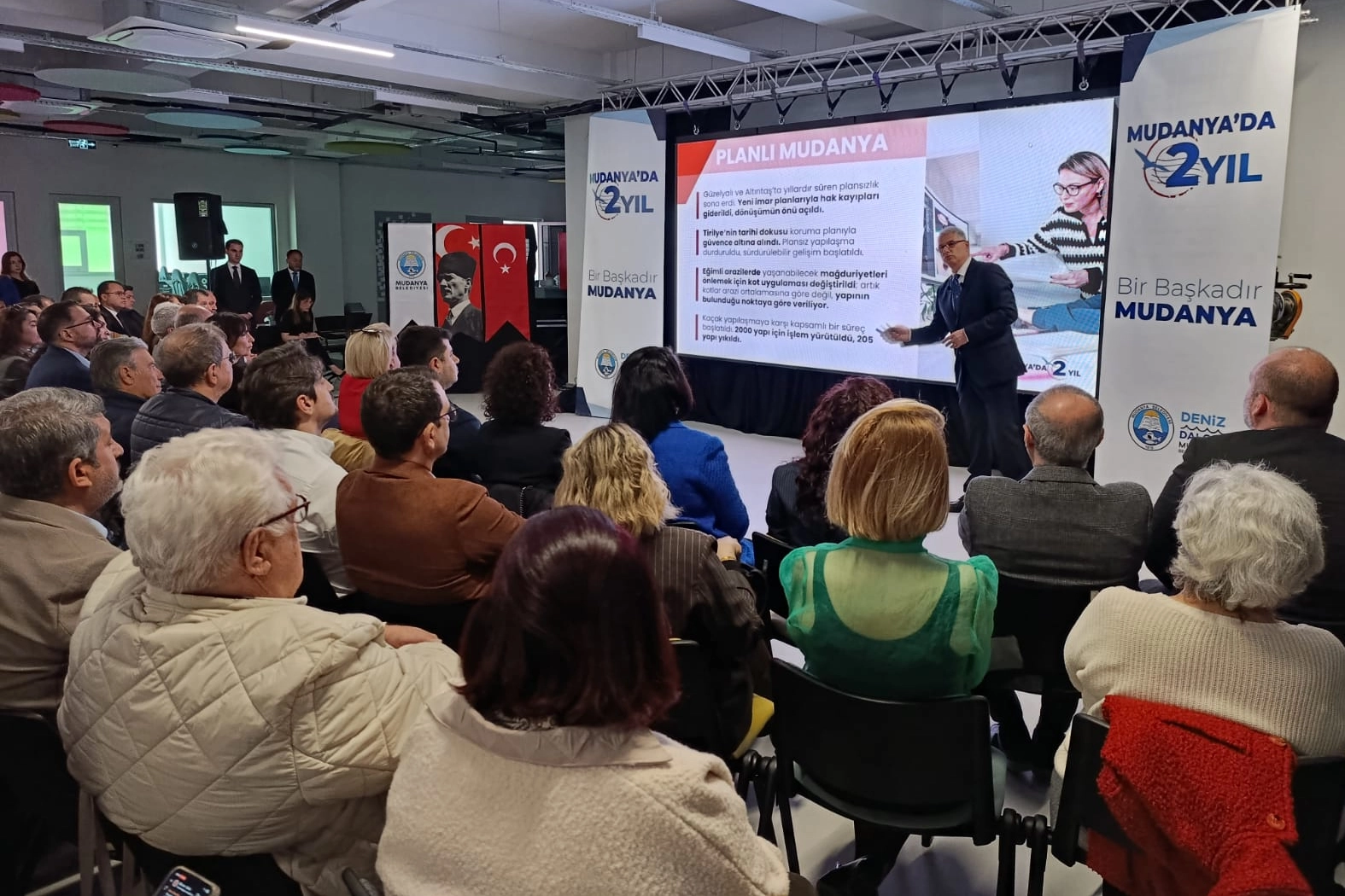 Göreve gelişinin ikinci yılında düzenlenen kapsamlı toplantıda, “Başka Bir Mudanya” vizyonu doğrultusunda hayata geçirilen projeleri tüm ayrıntılarıyla kamuoyuyla paylaştı. Tamamlanan ve devam eden çalışmalarla yeni hedefler projelerin geniş perspektifle ela alındığı toplantıda, iki yılda ilçenin sessiz sedasız değişmediğini değişimin görüldüğü ve hissedildiği gibi konuşulduğunu da dile getirdi.