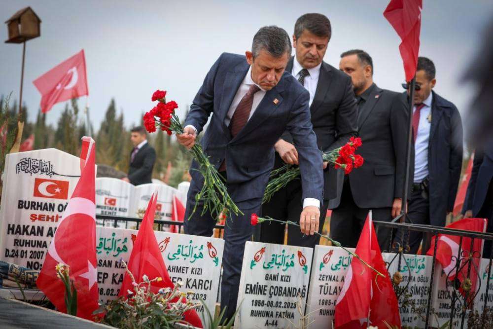 ADIYAMAN (PHA) - Gülbahar SÜNGÜ - CHP Genel Başkanı Özgür Özel, 6 Şubat 2023 depremlerinde hayatını kaybedenleri anmak için Adıyaman’da Deprem Şehitliği’ni ziyaret etti. Özel, mezarlara karanfil bırakarak dua etti ve yaptığı açıklamada, hükümetin deprem sürecindeki yönetimini sert sözlerle eleştirdi.