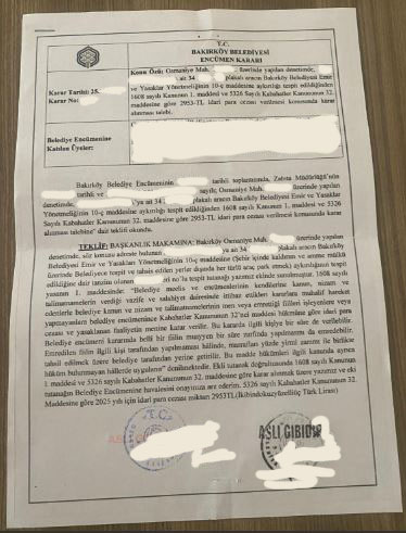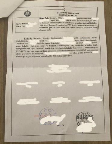 Bakırköy Belediyesi Emir ve Yasaklar Yönetmeliğinin 27 nolu kararı uyarınca; encümen tarafından 10/1 maddenin (ç) bendine göre Bakırköylüye binlerce trafik cezası(idari) yazıldığını geçtiğimiz gün yazmıştık. Yazmadığımız şey, vatandaşa sadece encümenin kestiği cezanın gönderilmesiydi. Oysa yasa gereği vatandaşa zabıtanın tuttuğu tutanak da gönderilmeliydi. Ceza tebligatını alan vatandaş derhal mahkemeye giderek, zabıtanın tuttuğu tutanağın gelen tebligatta olmadığını beyan edip, tebliğ zarfını da dilekçeyle birlikte ibraz ederse cezaların iptal edilmesi gerekir.