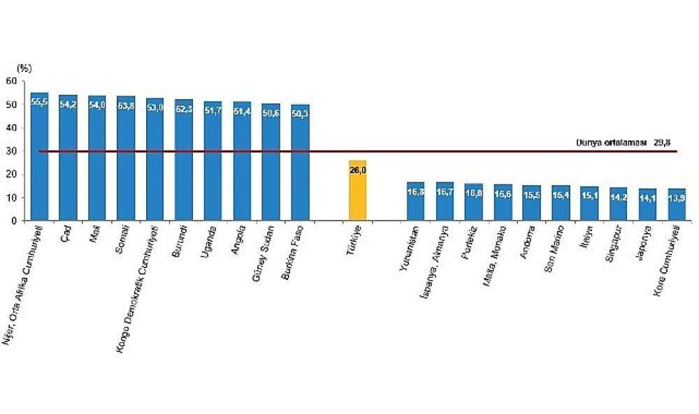Çocuk nüfus oranı dünya ortalaması, 2023 yılında %29,8 oldu. Türkiye'deki çocuk nüfus oranının %26,0 ile dünya çocuk nüfus ortalamasının altında kaldığı görüldü.